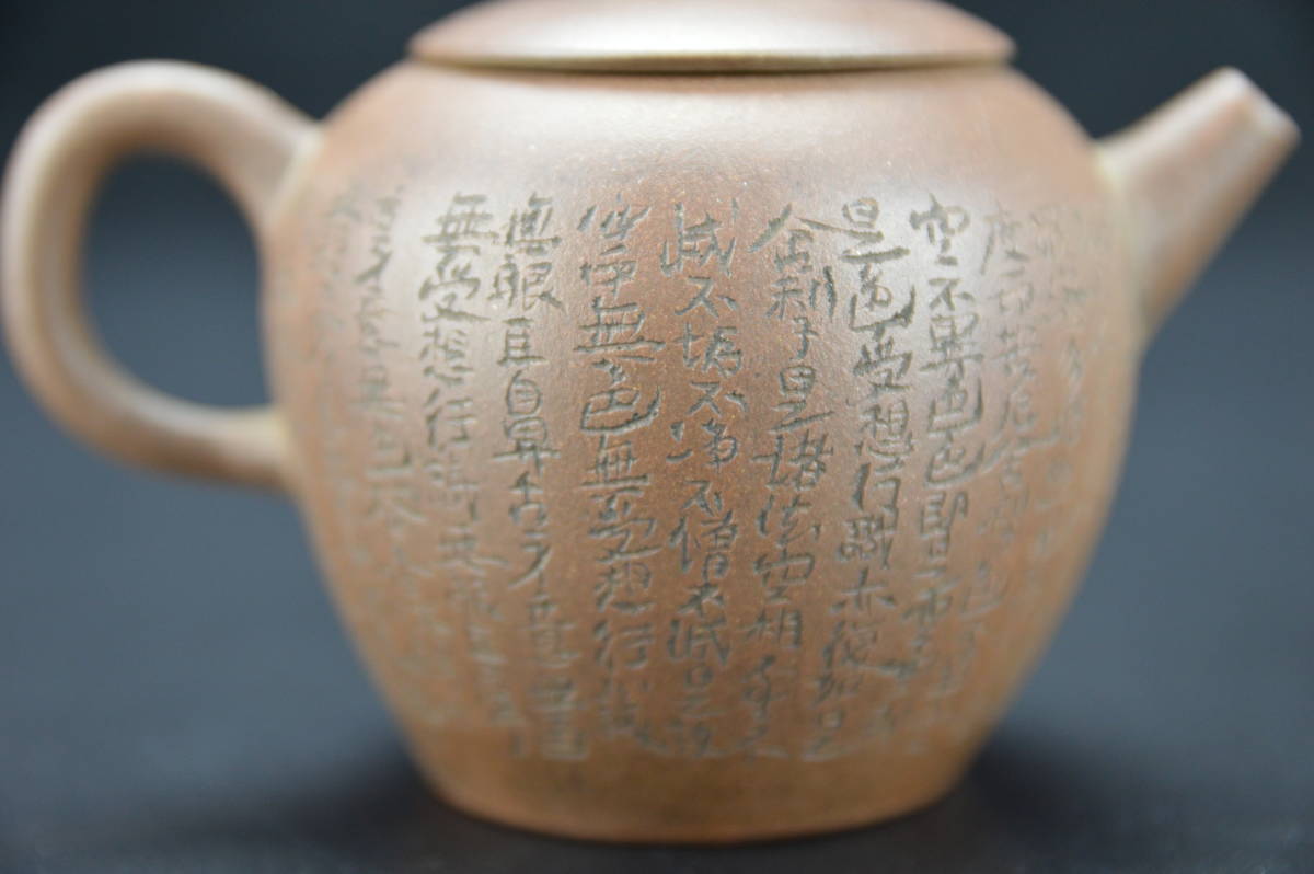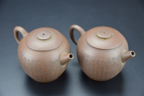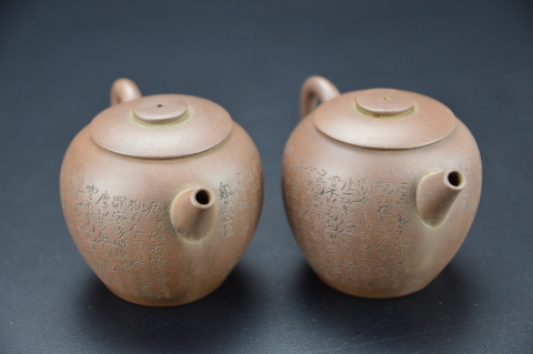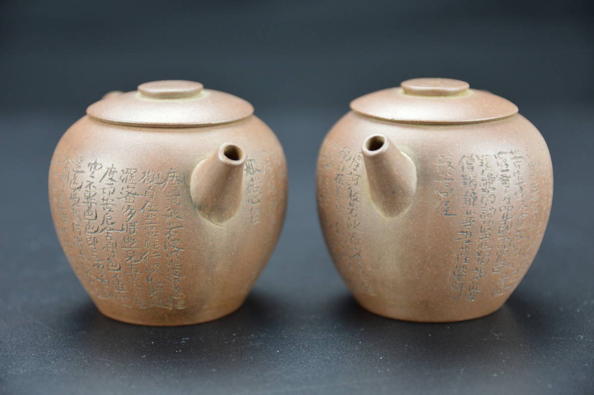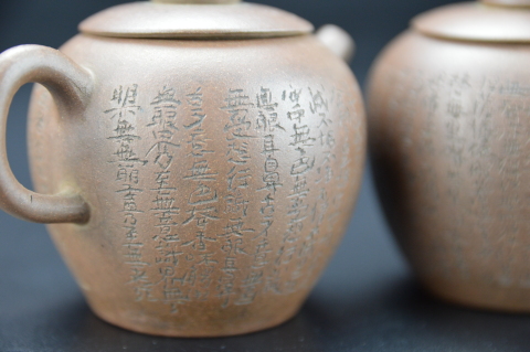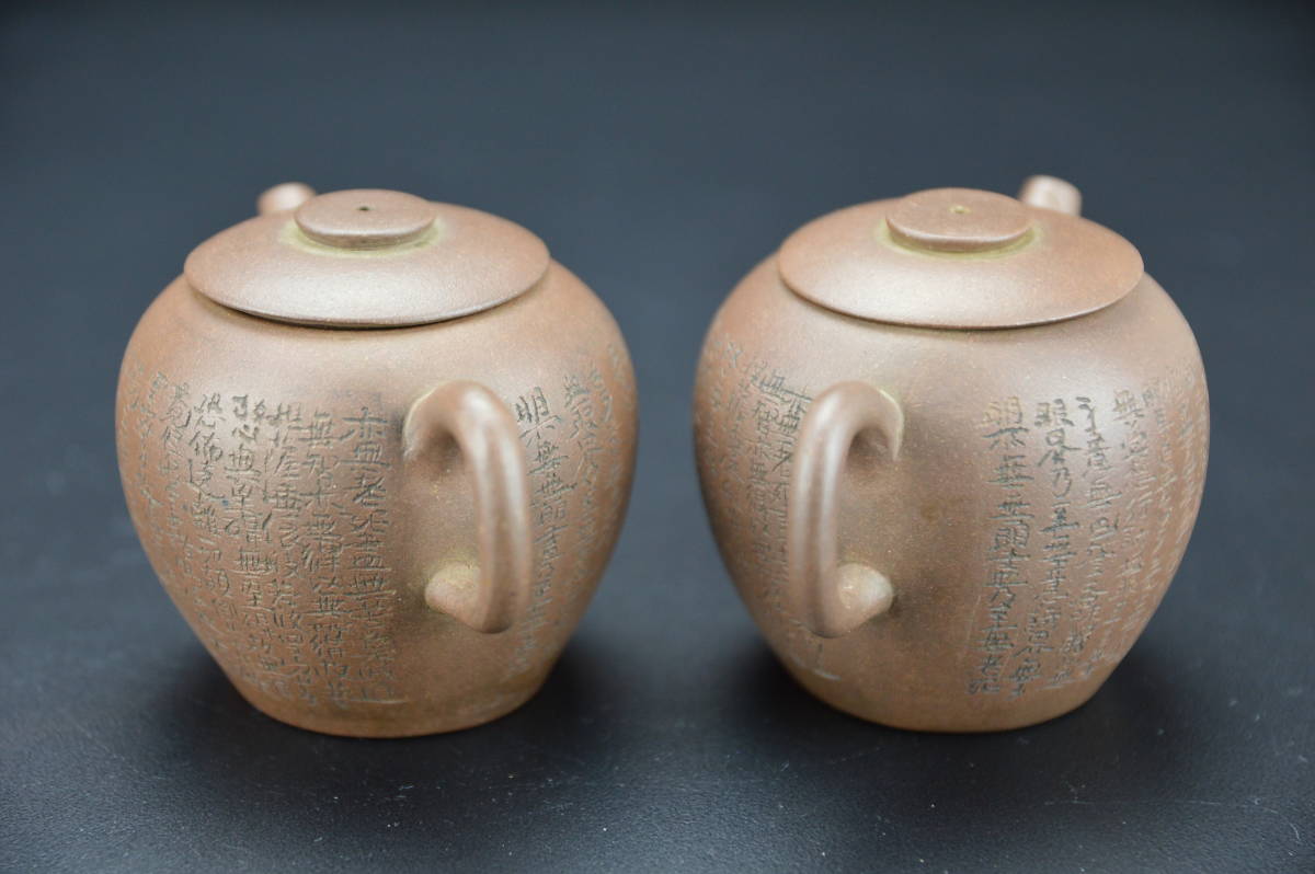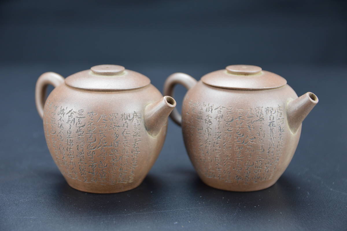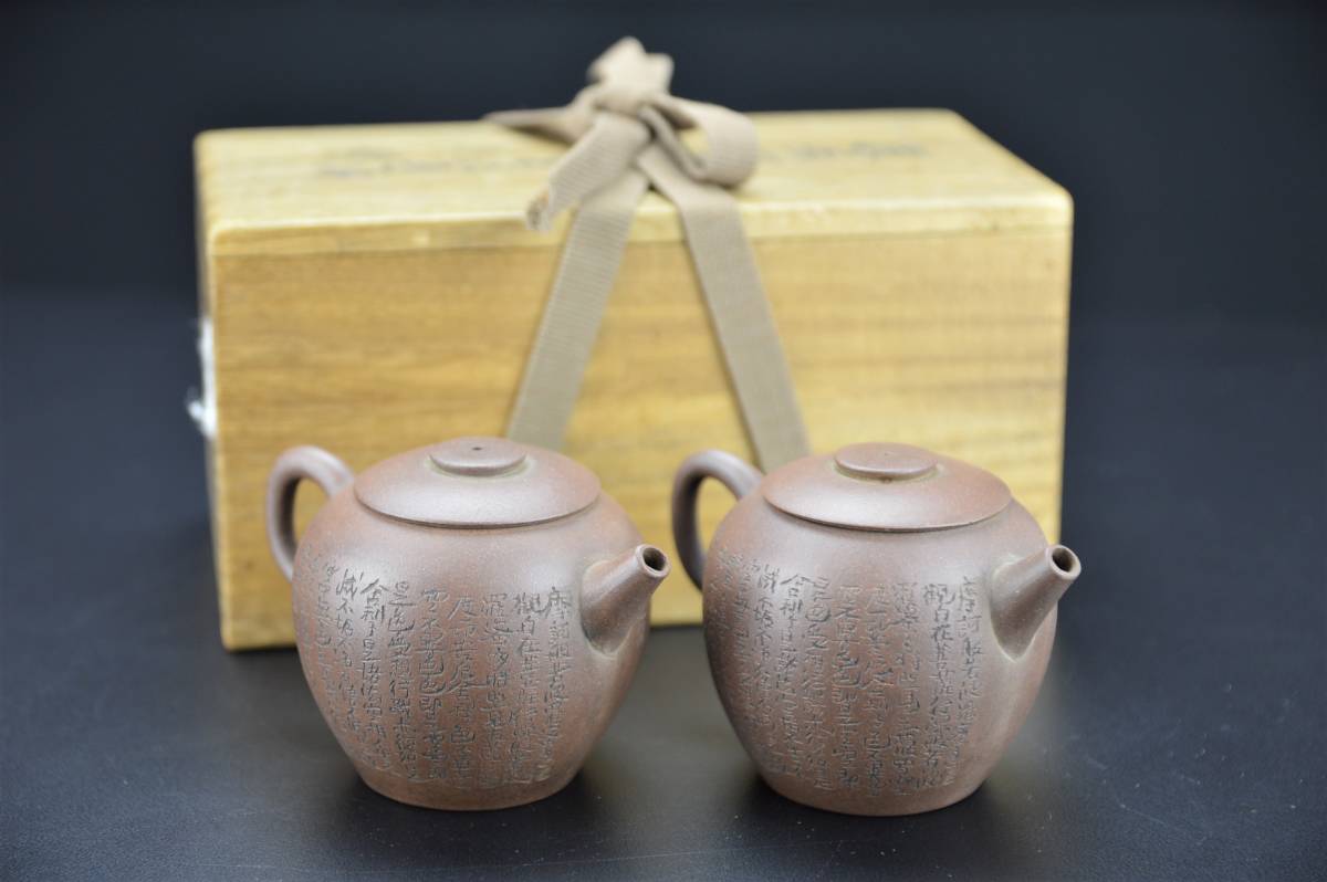 原文:【白翼】 般若心経彫 紫泥急須 一対 ★ 煎茶道具 唐物